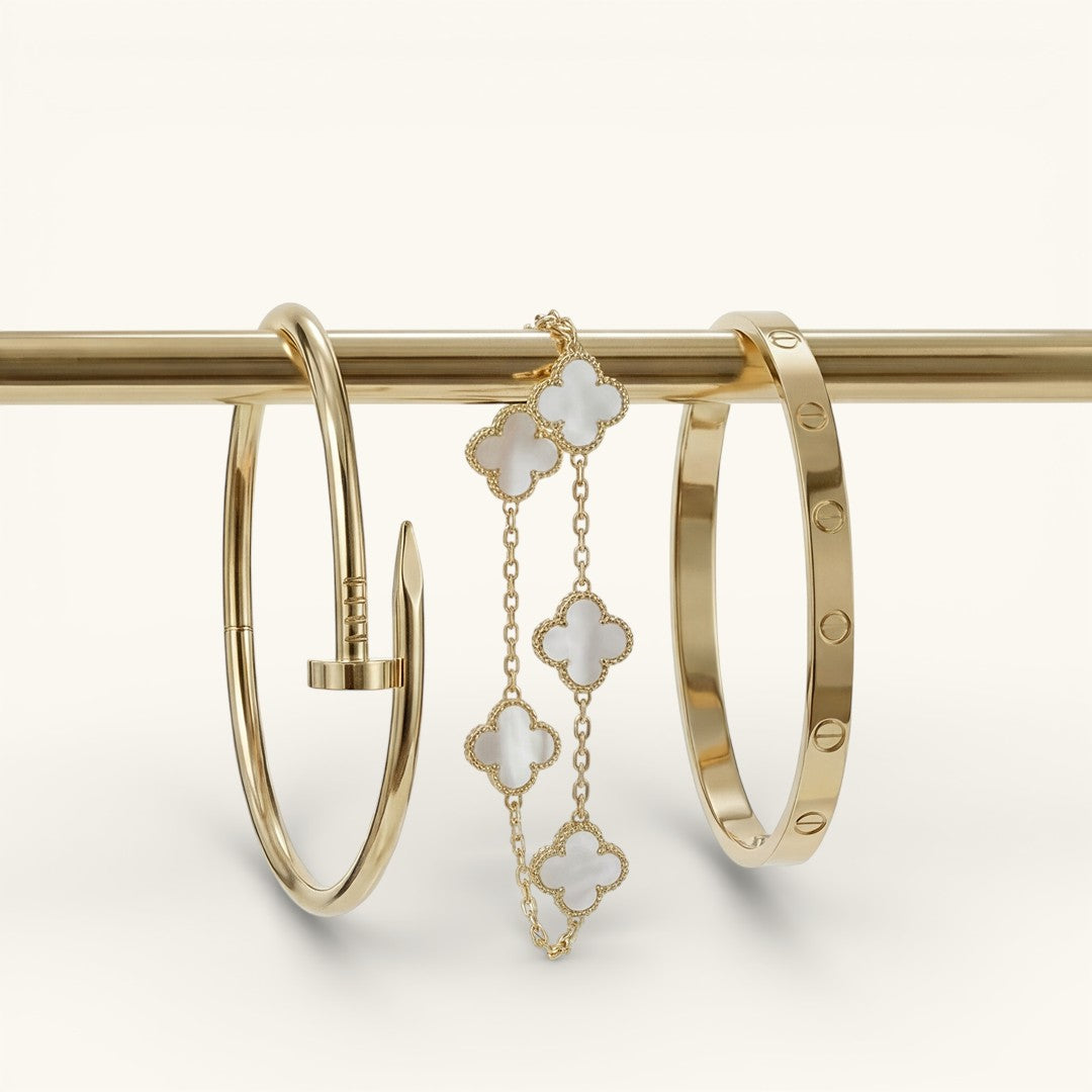 • Trinity & Clover Bracelet: A delicate and adjustable bracelet (16+5 cm) with charming details, available in gold or silver.
