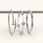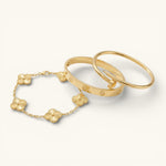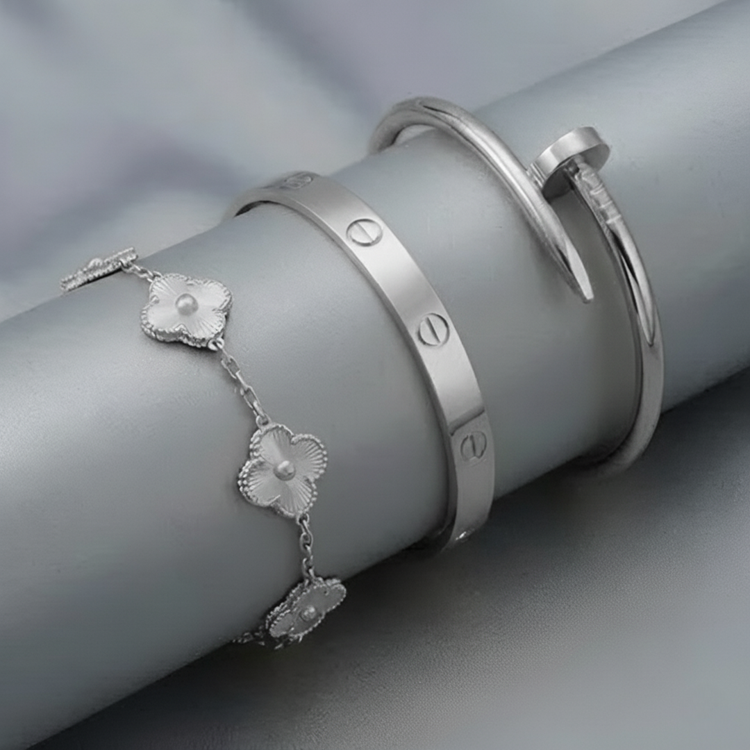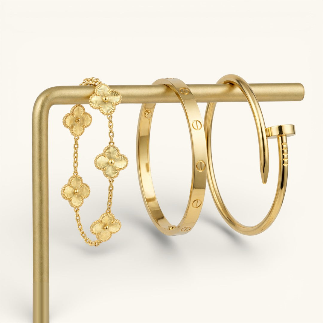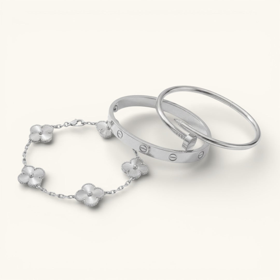 • Trinity & Clover Bracelet: A delicate and adjustable bracelet (16+5 cm) with charming details, available in gold or silver.